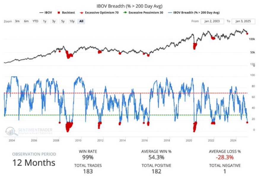 De iShares MSCI Brazil ETF (EWZ) daalde in 2024 van 32 dollar naar 22 dollar en presteerde zo meer dan -40% slechter dan de S&P 500. Eind ’24 – begin ’25 ging de selloff in overdrive met slechts een handvol bedrijven uit de Braziliaanse Bovespa-index boven het 200-daag gemiddeld.