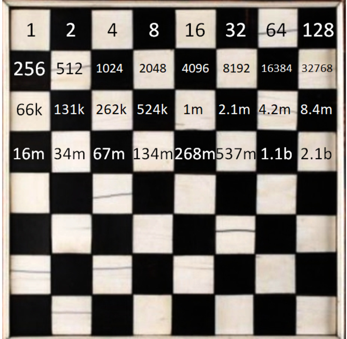 “Majesteit,” zei hij rustig, “geef mij één rijstkorrel op het eerste vakje van het bord. En verdubbel dat aantal op elk volgend vakje.”